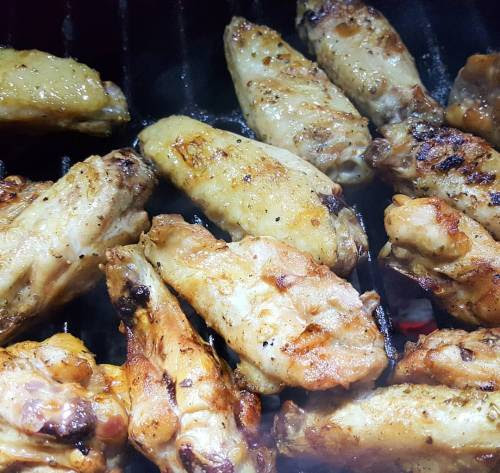 Hey Hank Hill- chicken wings over hardwood lump charcoal with pecan wood chips smoking. You got it wrong: “taste the heat, not the meat”. (at Woodstown, New Jersey)